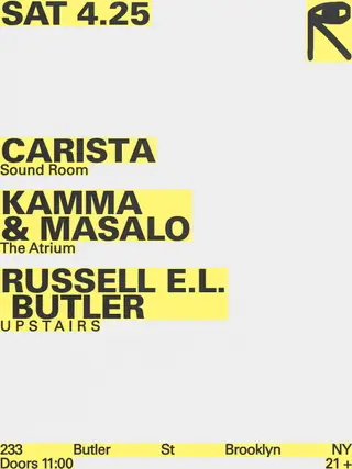 CARISTA, Kamma & Masalo, and Russell E.L. Butler perform at public records in New York City on May 30, 2026. CARISTA is known for her contributions to the house and techno genres, originating from the Netherlands. Kamma and Masalo, a collaborative duo, blend house music with elements of disco and funk, both hailing from Amsterdam. Russell E.L. Butler is an American producer recognized for his innovative approach to techno, often incorporating experimental sounds into his work. This event features a lineup focused on techno and house music.