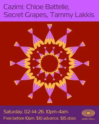 Cazimi: Chloe Battelle, Secret Grapes, Tammy Lakkis on February 14, 2026 at Jupiter Disco, New York features Chloe Battelle, Tammy Lakkis and Secret Grapes performing DJ sets.