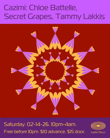 Cazimi: Chloe Battelle, Secret Grapes, Tammy Lakkis takes place at Jupiter Disco in New York, United States on Saturday, February 14, 2026. Featuring Chloe Battelle, Tammy Lakkis, Secret Grapes.