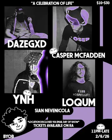 Celebration of Life feat. Yesterdayneverhappened, Dazegxd, Casper McFadden takes place at TBA in Los Angeles, United States on Friday, February 6, 2026. Featuring Yesterdayneverhappened, Dazegxd, Loqum, Sian Nevenicola.