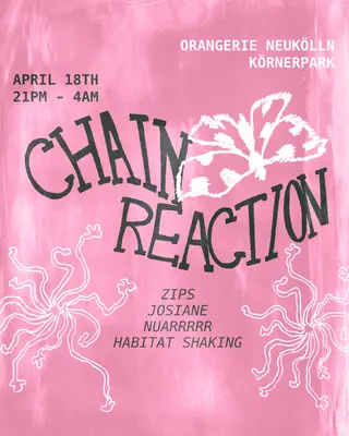 Chain Reaction takes place at Orangerie Neukölln in Berlin, Germany on April 18, 2026. Featuring Zips, Josiane, nuarrrrr, Habitat Shaking. Progressive House and House sounds all night.