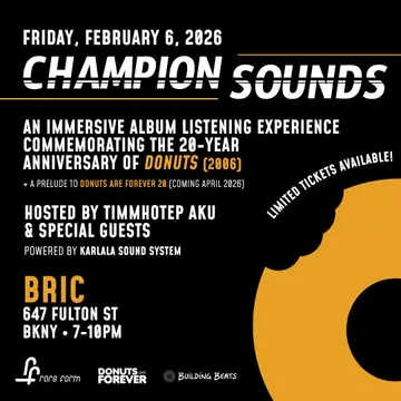 Champion Sounds: An Immersive Listening of Donuts (Prelude to DAF20) at BRIC ARTS takes place at Bric House in New York, United States on Friday, February 6, 2026. Hip-Hop, Electronica.