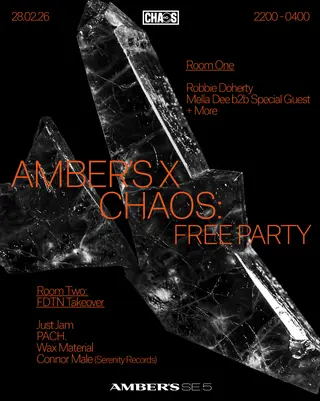 Chaos (Free Party): Robbie Doherty, Mella Dee b2b Special Guest on February 28, 2026 at Amber's, Manchester features Robbie Doherty, Mella Dee, Just Jam, PACH and Wax Material performing house DJ sets.