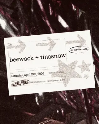 Set at Chatroom at Elsewhere, Chatroom: beewack + tinasnow 2026 brings together artists and fans in New York on Saturday, April 11, 2026, featuring beewack and tinasnow. This event brings together artists and fans who share a passion for dance music culture and electronic sounds.