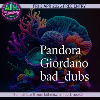 Experience Chemistry Club 2026, a significant moment in Berlin, Germany's electronic music calendar on Friday, April 3, 2026, featuring Pandora (1), Giordano, bad_dubs and 0 more artists. This event brings together artists and fans who share a passion for dance music culture and Bass, Afro Tech sounds.