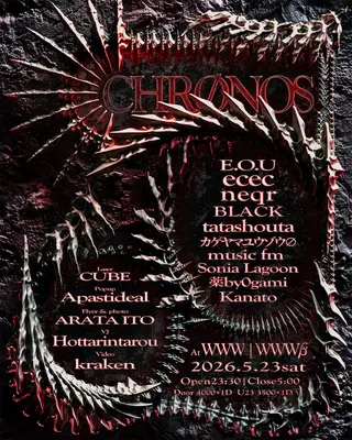 CHRØNOS takes place at WWW in Tokyo, Japan on May 23, 2026. Featuring E.O.U, ecec, music fm, Sonia Lagoon (2). Techno and Hardcore sounds all night.