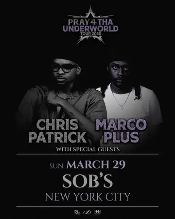 Chris Patrick & Marco Plus - Pray 4 Tha Underworld Tour 2026 takes place at SOBs in New York City, Unknown on Sunday, March 29, 2026. Featuring Chris Patrick. Hip-Hop, R&B.