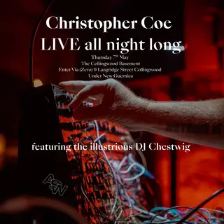 Christopher Coe Live all night long takes place at Collingwood Basement in Melbourne, Australia on May 7, 2026. Featuring Christopher Coe. Techno and Dub Techno sounds all night.