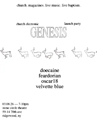 Church Electronic presents: Genesis Magazine Launch Party takes place at Stone Circle Theatre in New York, United States on March 8, 2026. Trance and Electronica sounds all night.