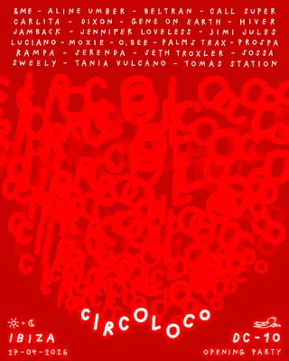 Circoloco Ibiza - Opening Party on April 27, 2026 at DC-10, Ibiza features &ME, Aline Umber, Beltran, Call Super, Carlita, Dixon, Gene On Earth, Hiver, Jamback, Jennifer Loveless, Jimi Jules, Luciano, Moxie, O.BEE, Palms Trax, Prospa, Rampa, Serenda, Seth Troxler, Sossa, Sweely, Tania Vulcano and Tomas Station performing house DJ sets.