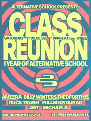 CLASS REUNION - 1 Year of Alternative School on May 2, 2026 at Northern Lights Lounge, Detroit features Ameera, Billy Winters, diedforthis, Duck Trash, Fullbodydurag, JMT (2) and Michael S performing DJ sets.