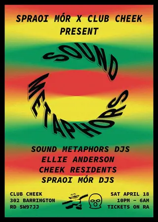 Club Cheek x Spraoi Mór: Sound Metaphors DJs, Ellie Anderson, Residents takes place at Club Cheek in London, United Kingdom on April 18, 2026. Featuring Sound Metaphors Djs, Ellie Anderson, Spraoi Mór. Deep House and Acid sounds all night.