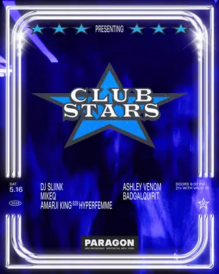 Club Stars takes place at Paragon in New York City on May 16, 2026. The lineup features DJ Sliink, a Newark-based producer known for his work in the Jersey club genre. MikeQ, a prominent figure in the ballroom scene, is recognized for his contributions to the New York club sound. Amarji King will perform alongside HYPERFEMME in a back-to-back set, both artists known for their dynamic club tracks. Also featured are Ashley Venom, who is known for her energetic sets blending various club styles, and Badgalquirit, an artist recognized for her unique fusion of reggaeton and electronic music. This event showcases a mix of techno and club genres.
