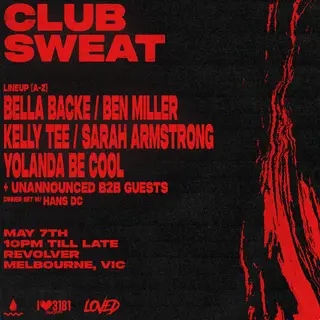 Club Sweat Showcase — LOVED & 3181 Thursdays takes place at Revolver Upstairs in Melbourne, Australia on May 7, 2026. Featuring Bella Backe, KELLY TEE, Yolanda Be Cool. Techno and House sounds all night.