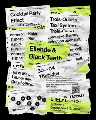 Clubnacht met Ellende & Black Teeth: Cocktail Party Effect. Trois-Quarts Taxi System, takes place at Stelplaats on April 30, 2026. Featuring Cocktail Party Effect, Trois-Quarts Taxi System, Selmz, nnrmnlg and 1 more. Bass and Experimental sounds all night.