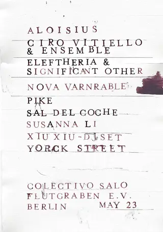 colectivo salo x flutgraben at Flutgraben in Berlin on Saturday, May 23, 2026. Ciro Vitiello and Eleftheria headline the event. The Experimental lineup also includes Significant Other, Nova Varnrable.