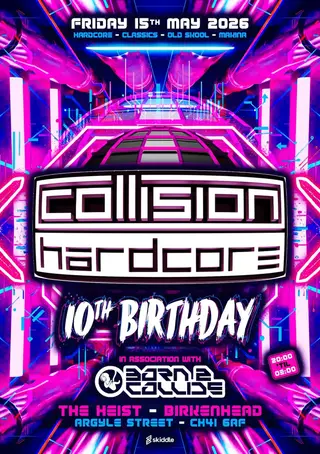 Collision Hardcore: The 10th Birthday takes place at The Heist in North on May 15, 2026. Featuring Klubfiller, DJ Kurt. Hardcore sounds all night.