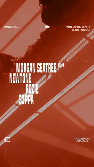 Colorado Charlie - Kingsday with Morgan Seatree (3hrs), NewTone, Rozie, S3PPA on April 27, 2026 at Colorado Charlie, The Hague features Morgan Seatree, NewTone, Rozie and S3PPA performing house DJ sets.