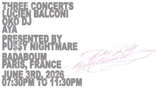 Concert — aya, Lucien Balconi, OKO DJ presented by PU$$Y NIGHTMARE takes place at Badaboum in Paris, France on June 3, 2026. Featuring aya, OKO DJ. Experimental and Pop sounds all night.