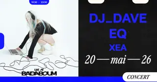 Concert — DJ_Dave, EQ, xea takes place at Badaboum in Paris, France on May 20, 2026. Featuring DJ_Dave, xea (1). Electro and Pop sounds all night.