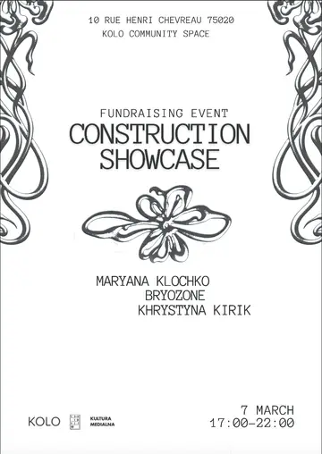 Construction Showcase takes place at TBA - KOLO community space in Paris, France on Saturday, March 7, 2026. Featuring Maryana Klochko, Bryozone, Khrystyna Kirik. Ambient, Electronica.