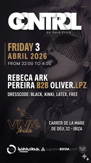 Control by Sara Frick takes place at TBA in Ibiza, Spain on April 3, 2026. Featuring Pereira. Techno and Minimal Techno sounds all night.