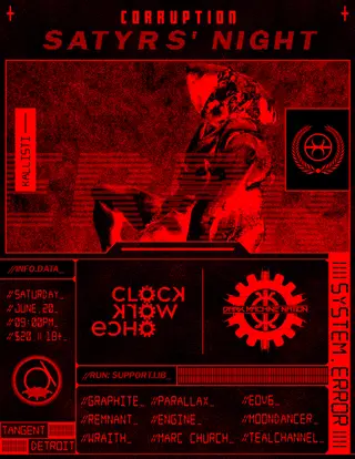 CORRUPTION: Satyrs' Night on June 20, 2026 at Tangent Gallery, Detroit features electronic music performances ebm DJ sets.