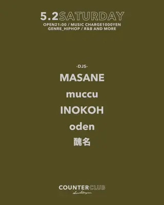COUNTERCLUB SATURDAY on May 2, 2026 at COUNTER CLUB, Tokyo features Oden performing DJ sets.