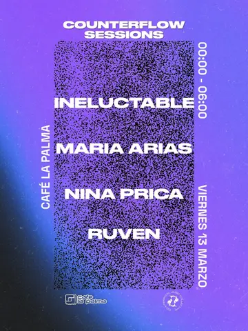 Counterflow Sessions I María Arias, RUVEN, Nina Prica, Ineluctable (Gratis hasta la 01:00) takes place at Cafe La Palma in Madrid, Spain on Friday, March 13, 2026. Featuring Maria Arias, RUVEN (2). Progressive House, House.