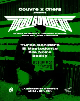 Couvre x Chefs: Turbo Sonidero - Paris Debut takes place at Alimentation Générale in Paris, France on April 16, 2026. Featuring Bile Noire. Reggaeton, Latin Bass.