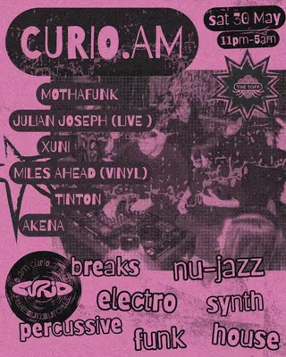 CURIO.AM takes place at The Toff in Town in Melbourne, Australia on May 30, 2026. Featuring Mothafunk, Miles Ahead, Chloe Tinton. Electro and Funk / Soul sounds all night.