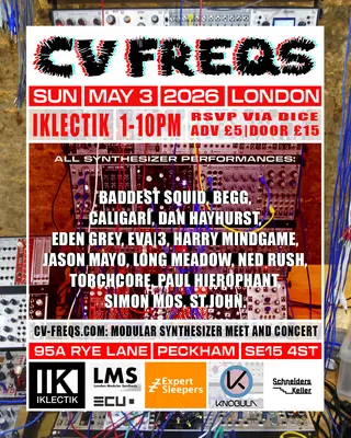 CV FREQS on May 3, 2026 at IKLECTIK, London features Eden Grey, Ned Rush, Simon Mós, Paul Hierophant and Caligari_ performing electro DJ sets.