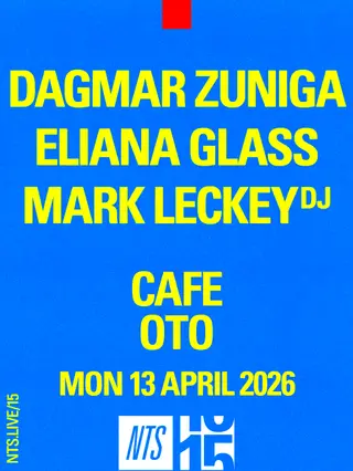 Dagmar Zuniga, Eliana Glass, Mark Leckey (NTS 15) on April 13, 2026 at Cafe OTO, London features electronic music performances DJ sets.