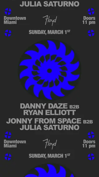 Danny Daze b2b Ryan Elliott takes place at Floyd in Miami, United States on March 1, 2026. Featuring Danny Daze, Ryan Elliott, Jonny From Space, Julia Saturno. Electro and Experimental sounds all night.