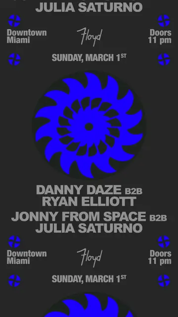 Danny Daze b2b Ryan Elliott takes place at Floyd in Miami, United States on Sunday, March 1, 2026. Featuring Danny Daze, Ryan Elliott, Jonny From Space, Julia Saturno. Electro, Experimental.