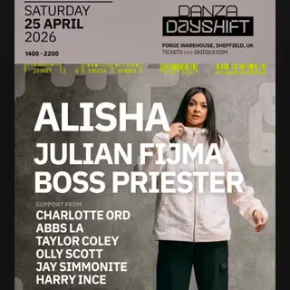 Danza Dayshift on April 25, 2026 at FORGE, Sheffield features ALISHA, Julian Fijma, Boss Priester and Charlotte Ord performing house DJ sets.