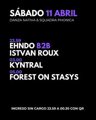 DANZA NATIVA Y SQUADRA PHONICA on April 11, 2026 at Under Club, Buenos Aires features Ehndo, Kyntral, Forest On Stasys and Istvan Roux performing techno DJ sets.