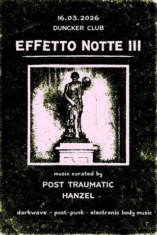 Join us on March 16, 2026, at the iconic Duncker Club in Berlin for the third installment of Effetto Notte, a night dedicated to the darker corners of the electronic music spectrum. Renowned for its rich history in the Goth and industrial scenes, Duncker Club sets the perfect stage for an evening filled with atmospheric sounds and pulsating rhythms. This edition promises an eclectic blend of darkwave, post-punk, EBM, and industrial, featuring classic bat cave anthems alongside heavier industrial beats. The lineup showcases a diverse selection of artists who excel in creating moody soundscapes ideal for both dancing and introspection. As Berlin continues to be at the forefront of the electronic music culture, Effetto Notte III encapsulates the city's vibrant underground scene, making it a noteworthy occasion for fans of the genre. Get ready to immerse yourself in a night where dark music reigns supreme.