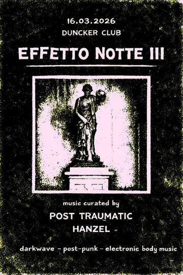 Dark Monday-Effetto Notte III 2026 takes place at the renowned Dunckerclub in Berlin, Germany on Monday, March 16, 2026. This event brings together artists and fans who share a passion for dance music culture and EBM, Post-Punk sounds.