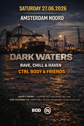 DARK WATERS takes place at TBA - Amsterdam Noord in Amsterdam, Netherlands on June 27, 2026. Techno and Electronica sounds all night.