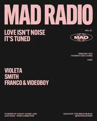 DASH: Violeta, SMITH, FRANCO & VIDEOBOY takes place at Mad Radio Miami in Detroit, United States on February 12, 2026. Featuring Violeta, VIDEOBOY. House and Electronic sounds all night.