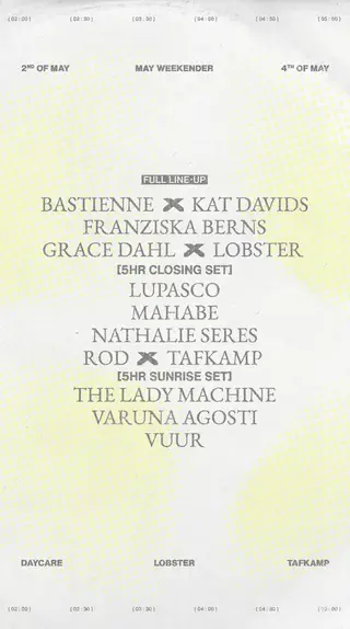 DAYCARE x Lobster x TAFKAMP Weekender takes place at BRET in Amsterdam, Netherlands on May 2, 2026. Featuring Bastienne, Kat Davids, Franziska Berns, Grace Dahl and 9 more. Techno and House sounds all night.