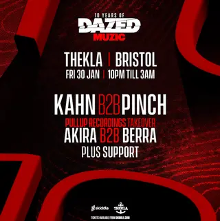 Dazed Muzic presents: Kahn b2b Pinch on January 30, 2026 at Thekla, Bristol features BERRA, Akira, STEADY and Bateman performing DJ sets.