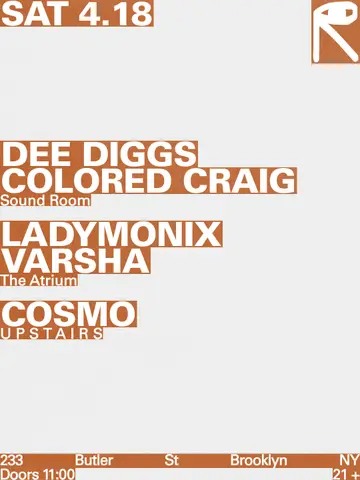 Dee Diggs + Colored Craig / LADYMONIX + VARSHA / Cosmo takes place at public records in New York City, Unknown on April 18, 2026. Featuring Dee Diggs, Colored Craig, LADYMONIX, VARSHA and 1 more. House.