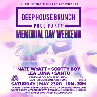 Deep House Brunch POOL PARTY [Memorial Day Saturday] takes place at White Rabbit Sky Lounge at The Valorian (Formerly Skybar at Mondrian) in Los Angeles, United States on May 23, 2026. Featuring Scotty Boy. House and Deep House sounds all night.