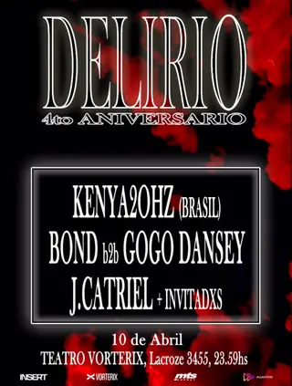 delirio 4to. ANIVERSARIO on April 10, 2026 at Teatro Vorterix, Buenos Aires features J.Catriel and KENYA20HZ performing techno DJ sets.