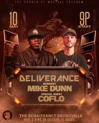 Deliverance Mike Dunn & Special Guest Coflo on May 10, 2026 at Renaissance Bronzeville, Chicago features Mike Dunn and Coflo performing house DJ sets.