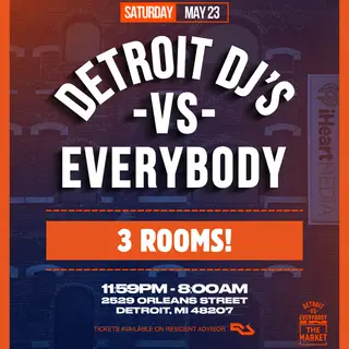 DETROIT DJ'S -VS- EVERYBODY (Movement Weekend) on May 23, 2026 at The Market, Detroit features Darryl G, Detroit House Collective, Detroit Techno Militia 2x4, DJ I.V., DJ KILLA SQUID, DJ Skeez, DUANE (US), GIADETROIT, Henry Brooks, John Collins (US), Nick Speed, Rimarkable, Sheefy McFly and Stacey Hotwaxx Hale performing techno DJ sets.