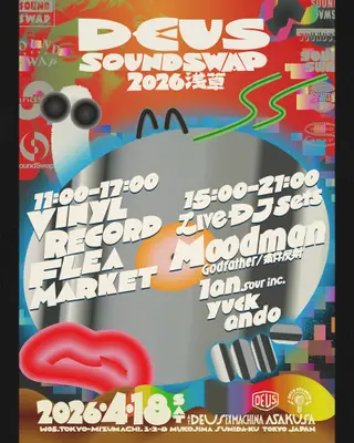 DEUS SOUND SWAP 2026 takes place at Deus Ex Machina Asakusa in Tokyo, Japan on April 18, 2026. Featuring Moodman. House and Hip-Hop sounds all night.