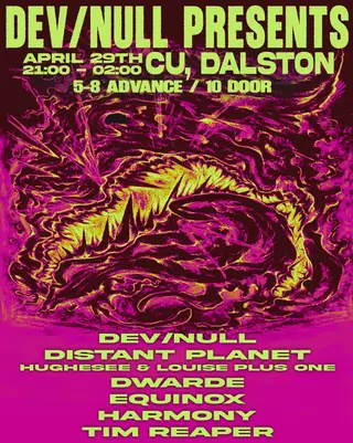 Dev/Null Presents #1 takes place at Cu in London, United Kingdom on April 29, 2026. Featuring Dev/Null, Hughesee, Louise Plus One, Dwarde and 2 more. Hardcore and Jungle sounds all night.